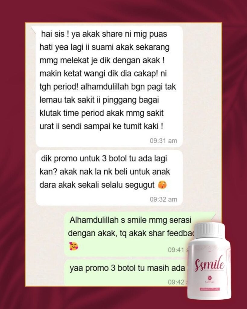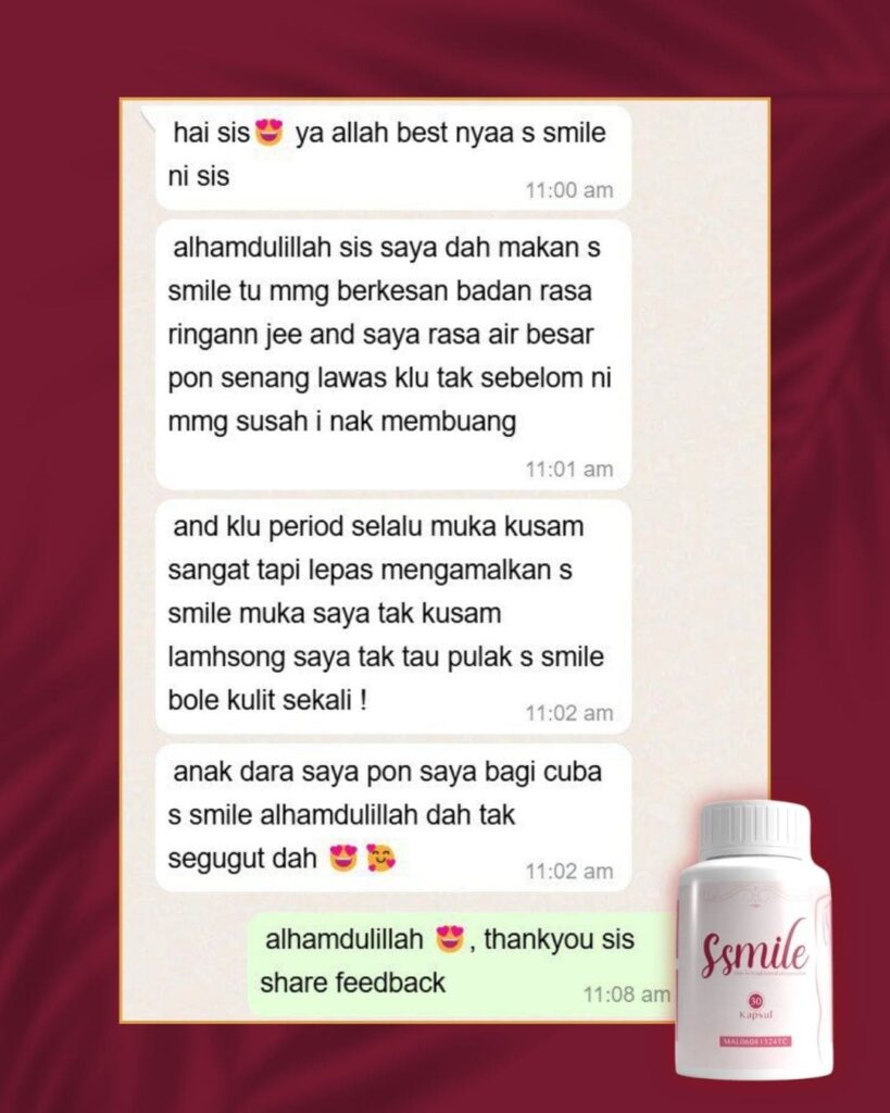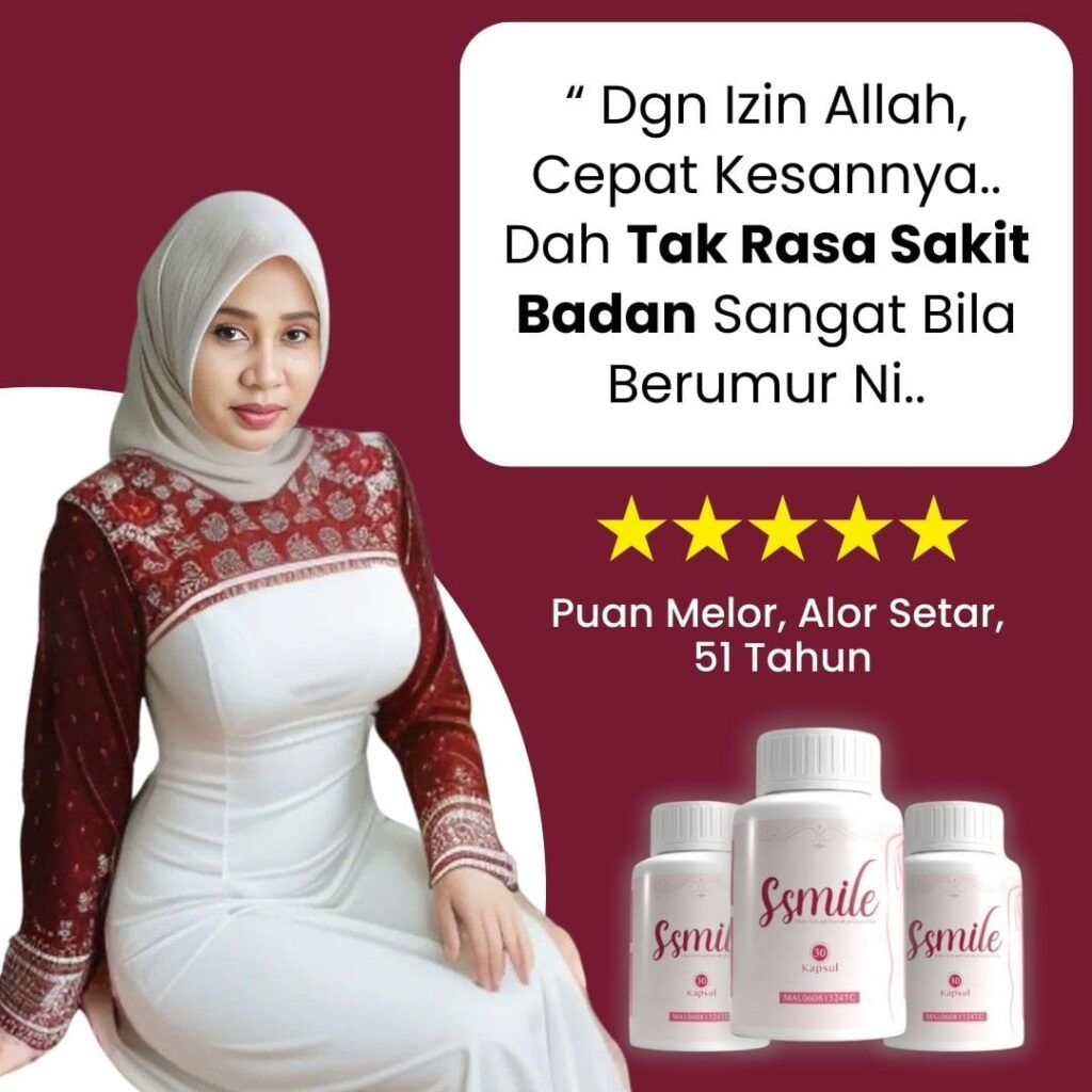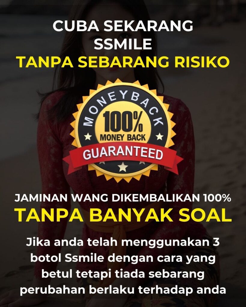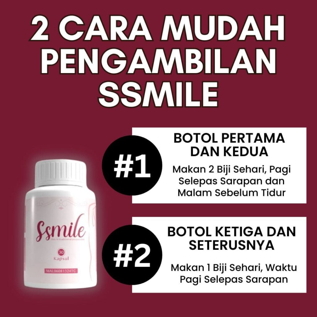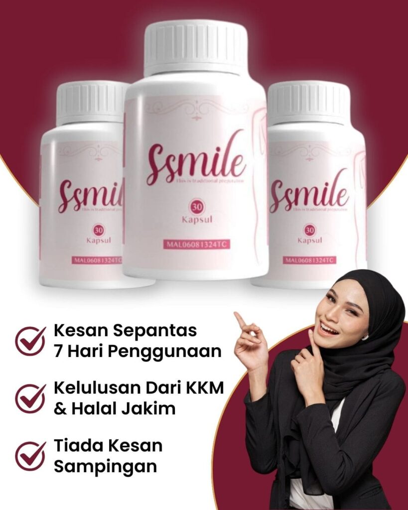 Tidak ada kesan sampingan. Selamat untuk digunakan sebab SSMILE ini diperbuat dari 100% Ekstrak dari Herba-Herba Terpilih.
