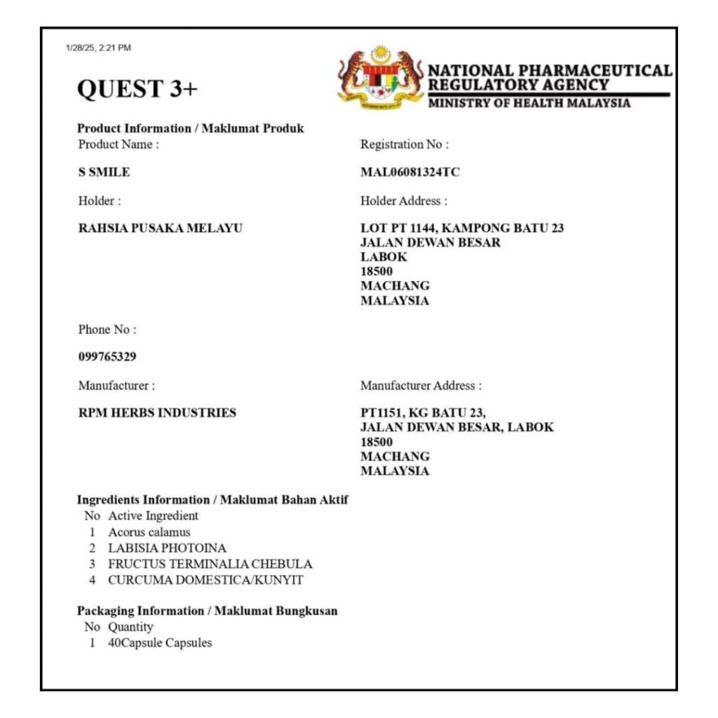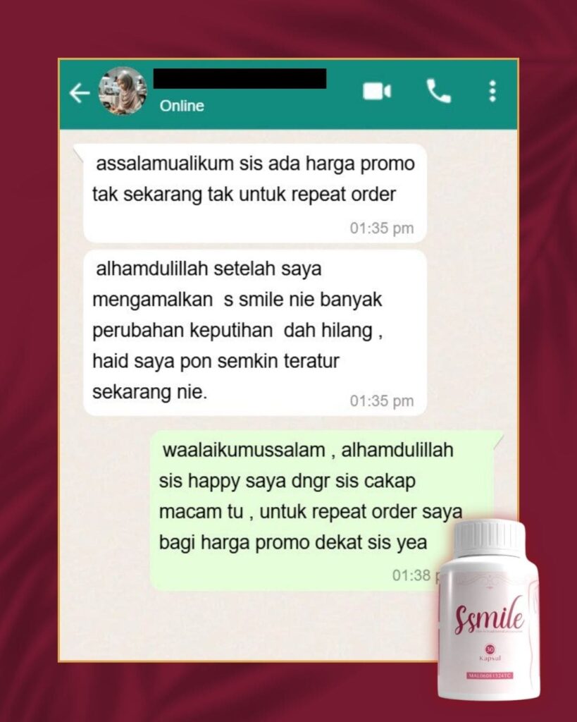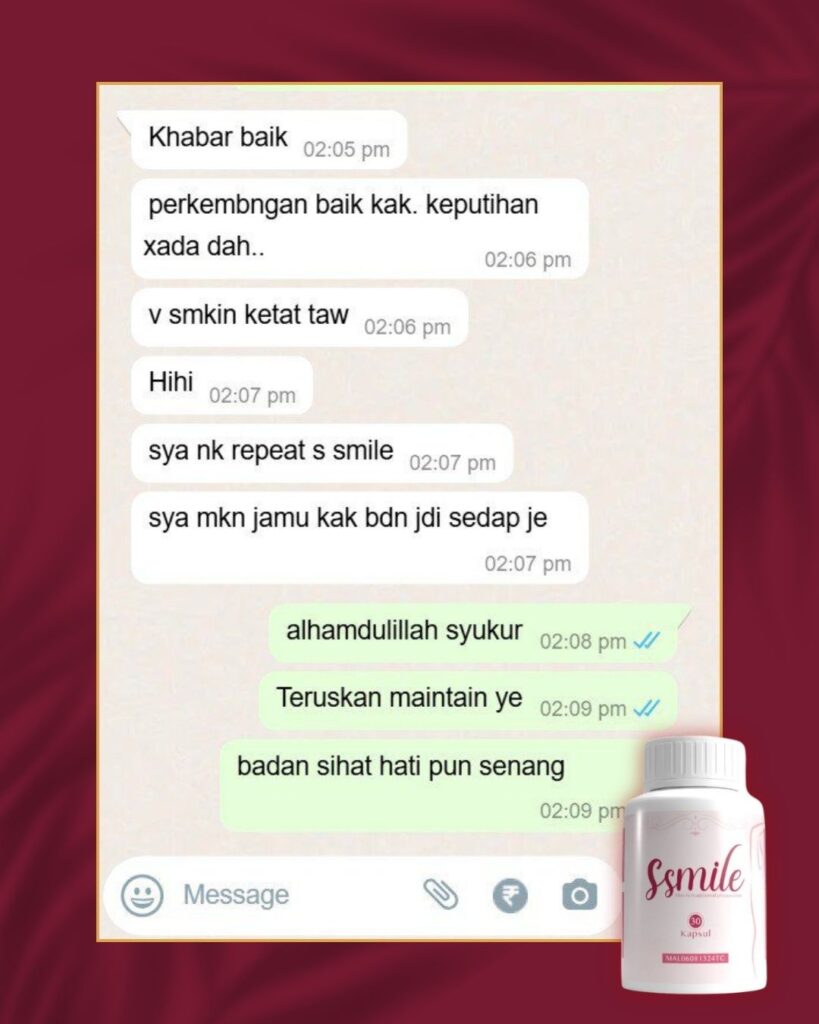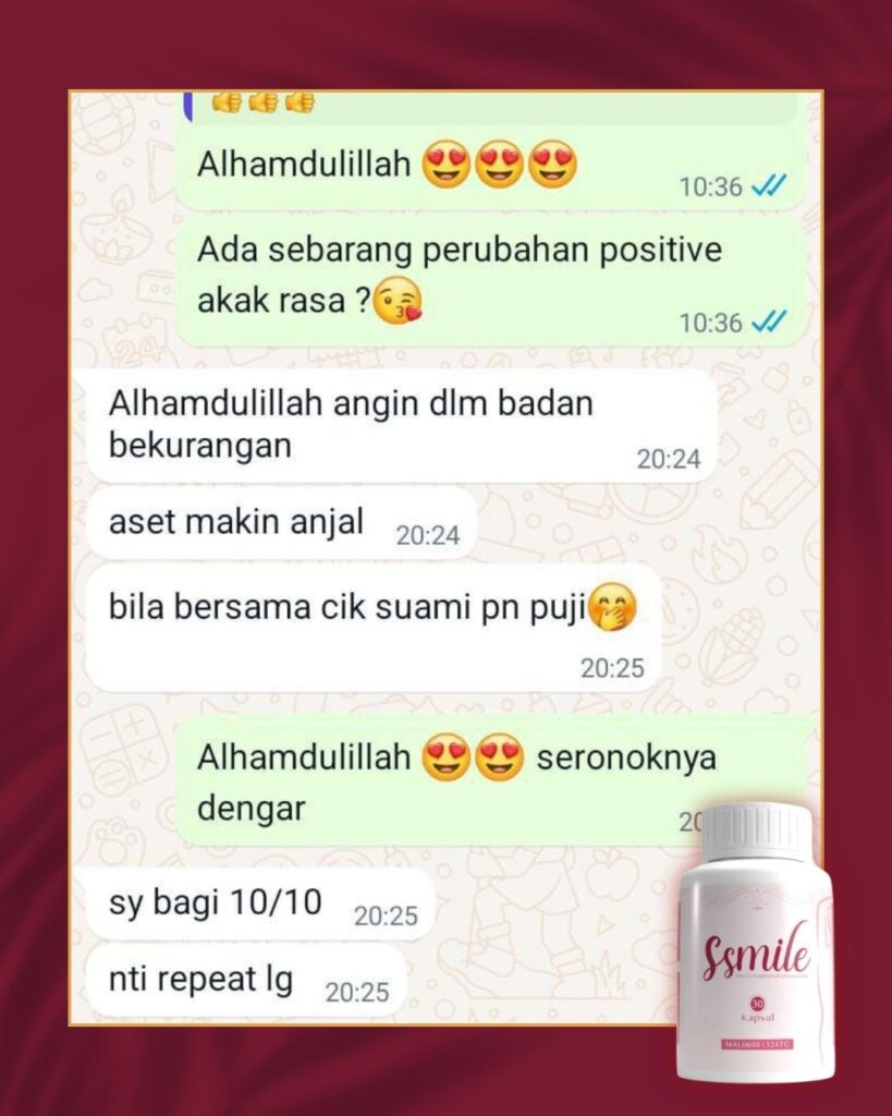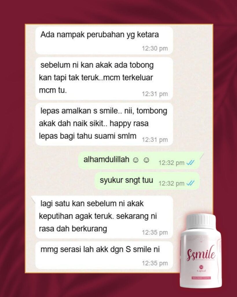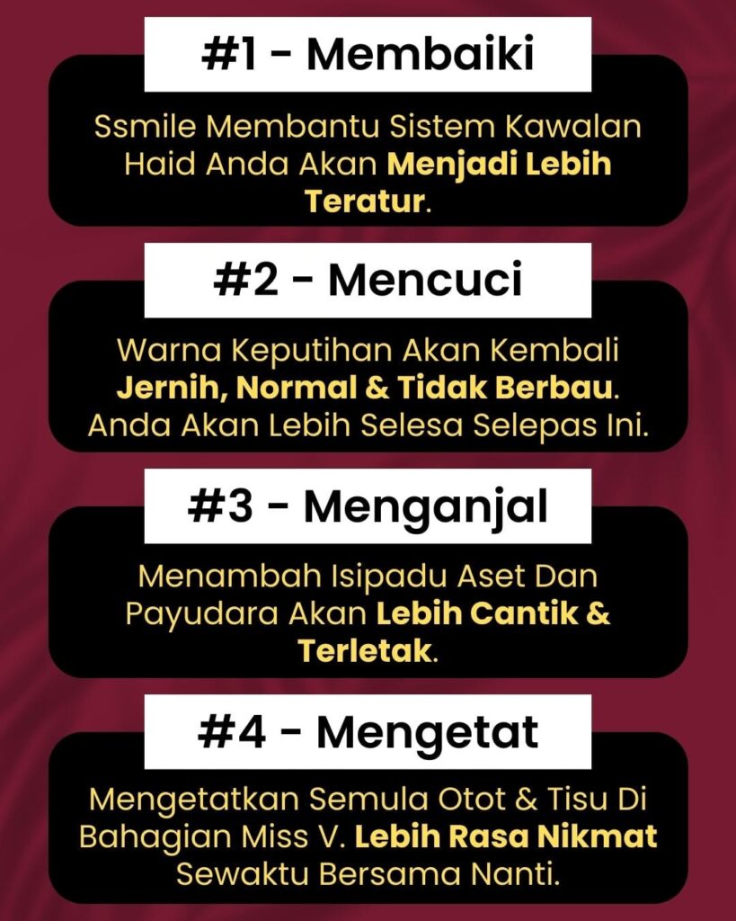 Tidak ada kesan sampingan. Selamat untuk digunakan sebab SSMILE ini diperbuat dari 100% Ekstrak dari Herba-Herba Terpilih.